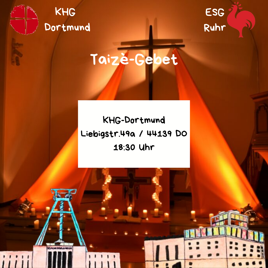 In ökumenischer Gemeinschaft mit der KHG feiern wir ein Taizé-Gebet. Anders als bei herkömmlichen Gottesdiensten legt dieses Gebet seinen liturgischen Schwerpunkt noch mehr auf Ruhe, Kontemplation und Anbetung.